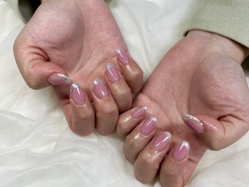 当日のピンクベースにオーロラやガラスのフレンチは血色がよく見えるだけでなく、どの衣装にも合うデザインですので本当にやってよかったデザインです!